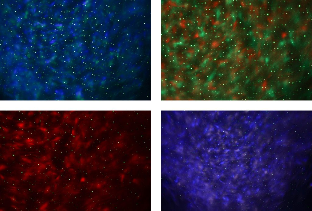The range of functions is probably the most important thing in such a projector. The encalife Ambience Galaxy & Star Projector allows you to set 21 different color modes. These are generated by an LED light as well as a green laser. The color of the LED can be selected between red, green, blue, and white. Likewise, the different colors can be mixed.